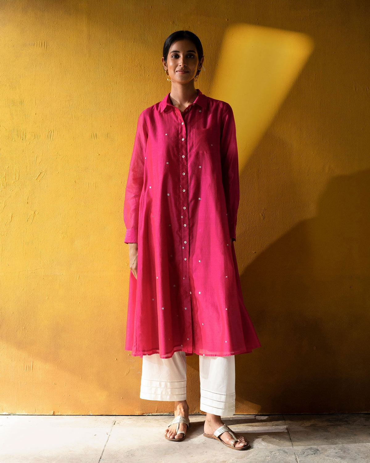 - Make a statement with our bright pink a-line kurta peppered with silver dots