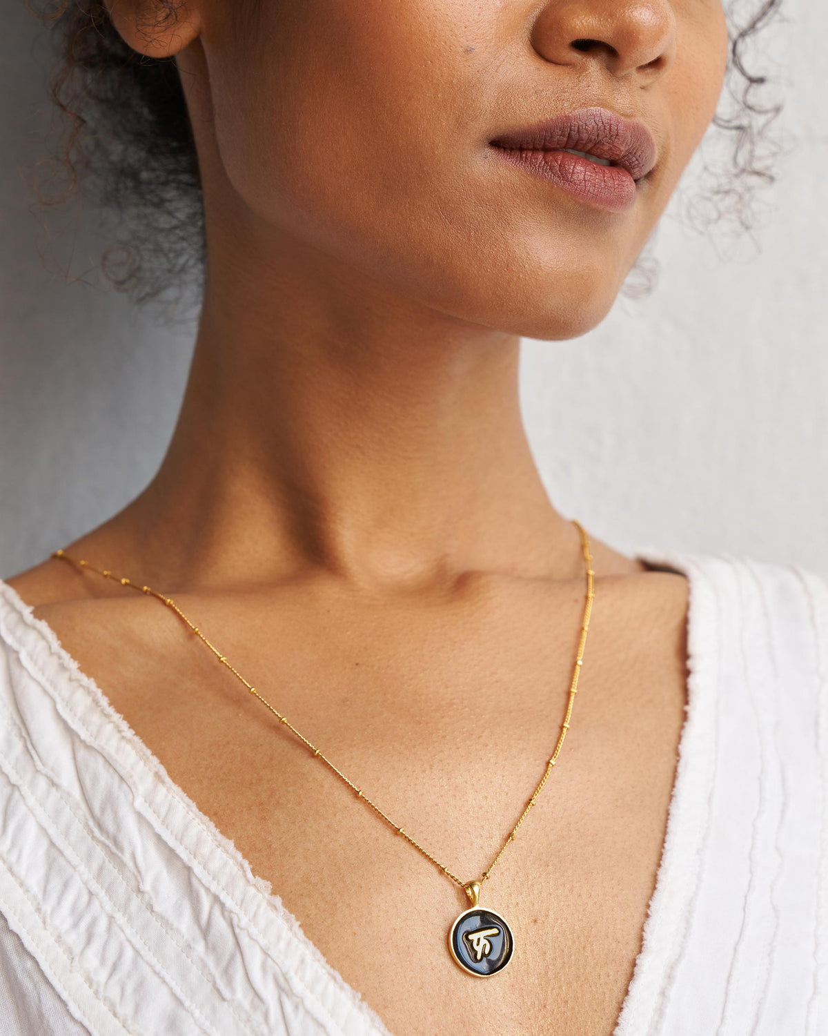 • With handwritten Devanagari akshar on one side and Roman letter on the other, this gold-plated charm with black enameling is the ideal gift for when you want to make it personal.