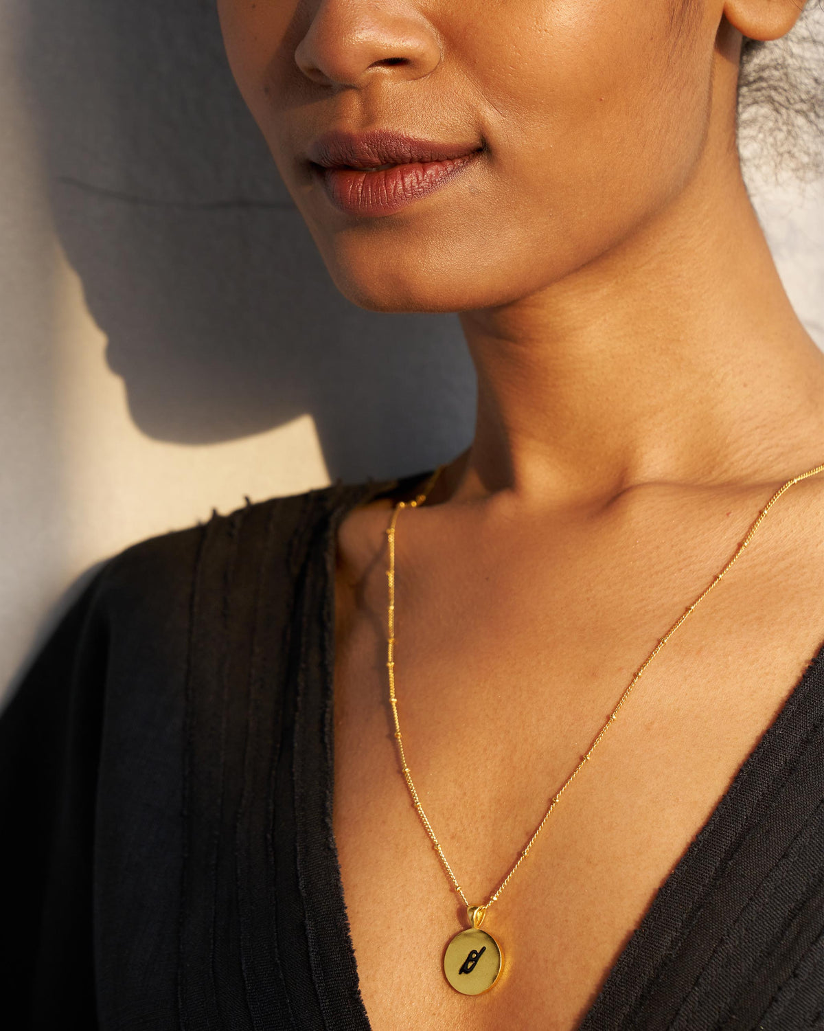 - With handwritten Devanagari akshar on one side and Roman letter on the other, this gold-plated charm with black enameling is the ideal gift for when you want to make it personal.