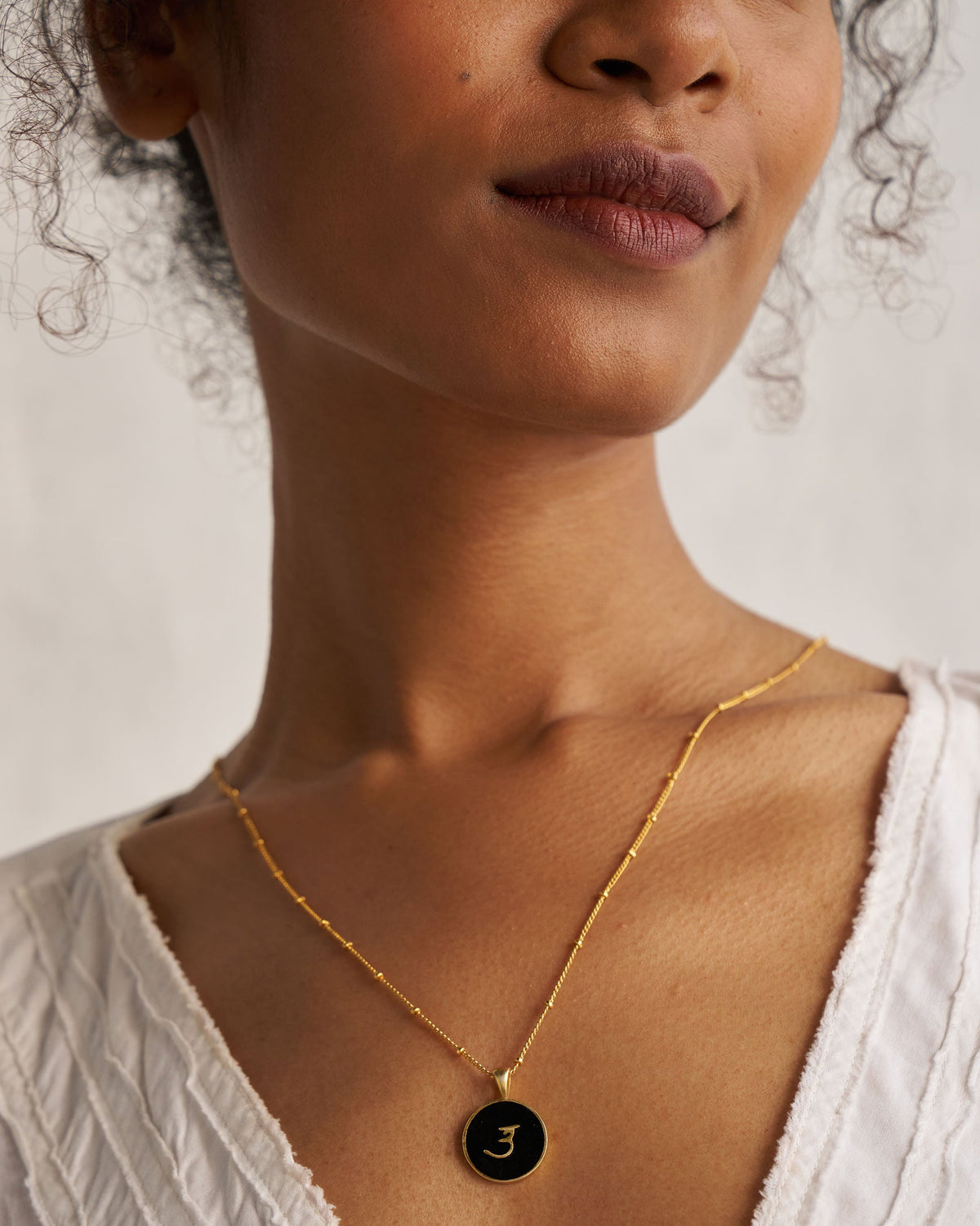 - With handwritten Devanagari akshar on one side and Roman letter on the other, this gold-plated charm with black enameling is the ideal gift for when you want to make it personal.