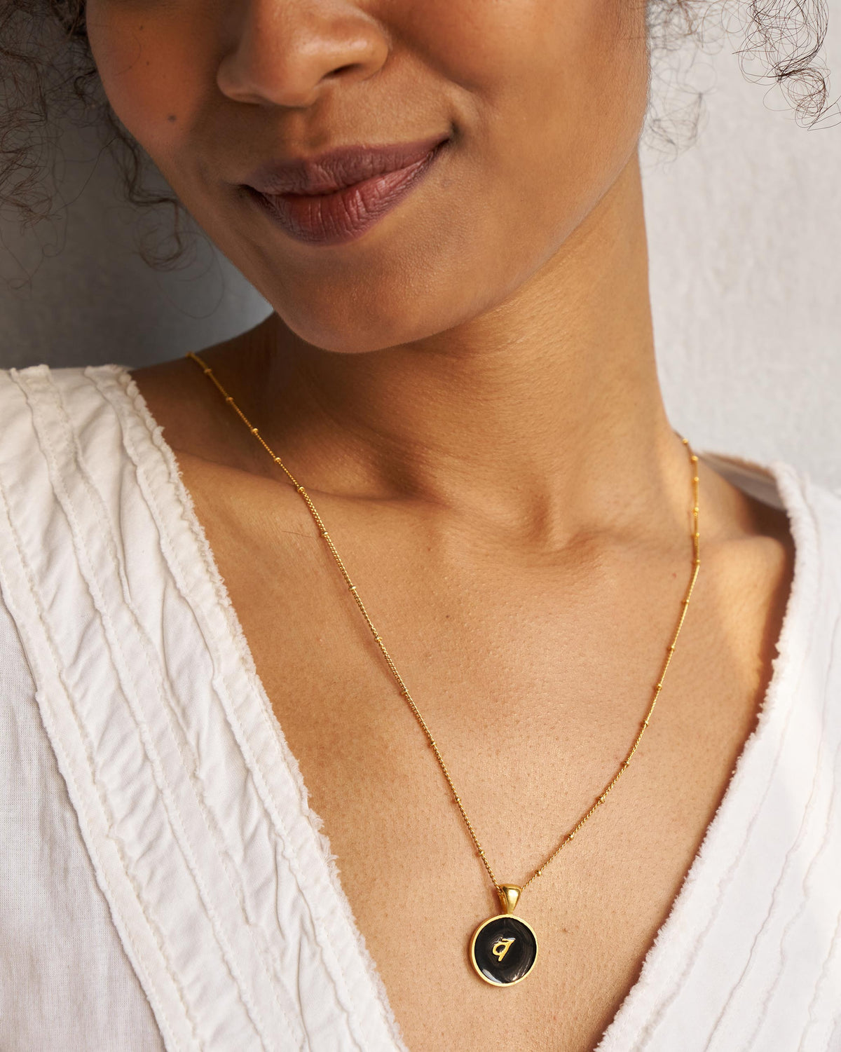 - With handwritten Devanagari akshar on one side and Roman letter on the other, this gold-plated charm with black enameling is the ideal gift for when you want to make it personal.