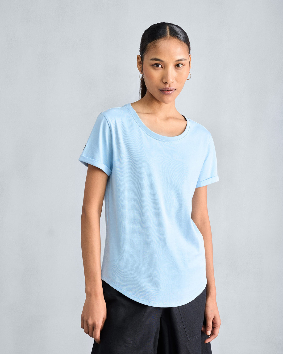 - Basics that are anything but basic; a comfy light blue cotton tee that promises to be the hardest working piece in your closet.