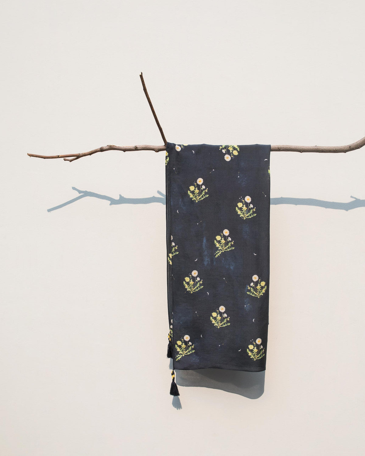- One of our favourites, this silk modal scarf comes with a pretty smattering of sunshine-hued dandelions and a neat mustard border