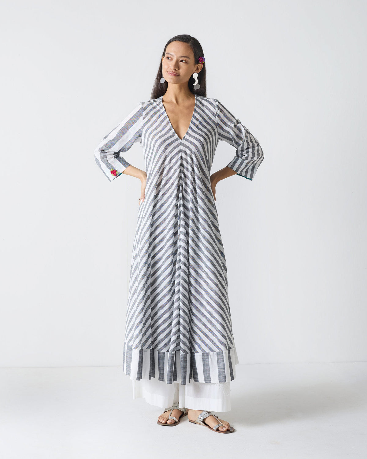 • The Domino Kurta in our signature charcoal and white sripes is a bold yet refined piece that plays with pattern and texture.