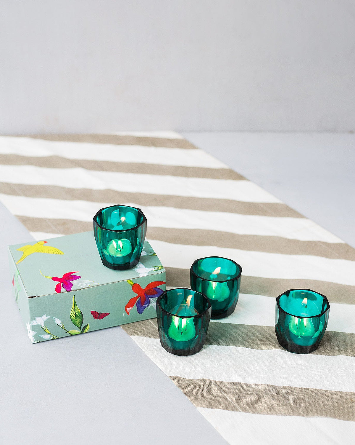 • Infuse your homes with these emerald cut-glass votives and the dancing flicker of candlelight