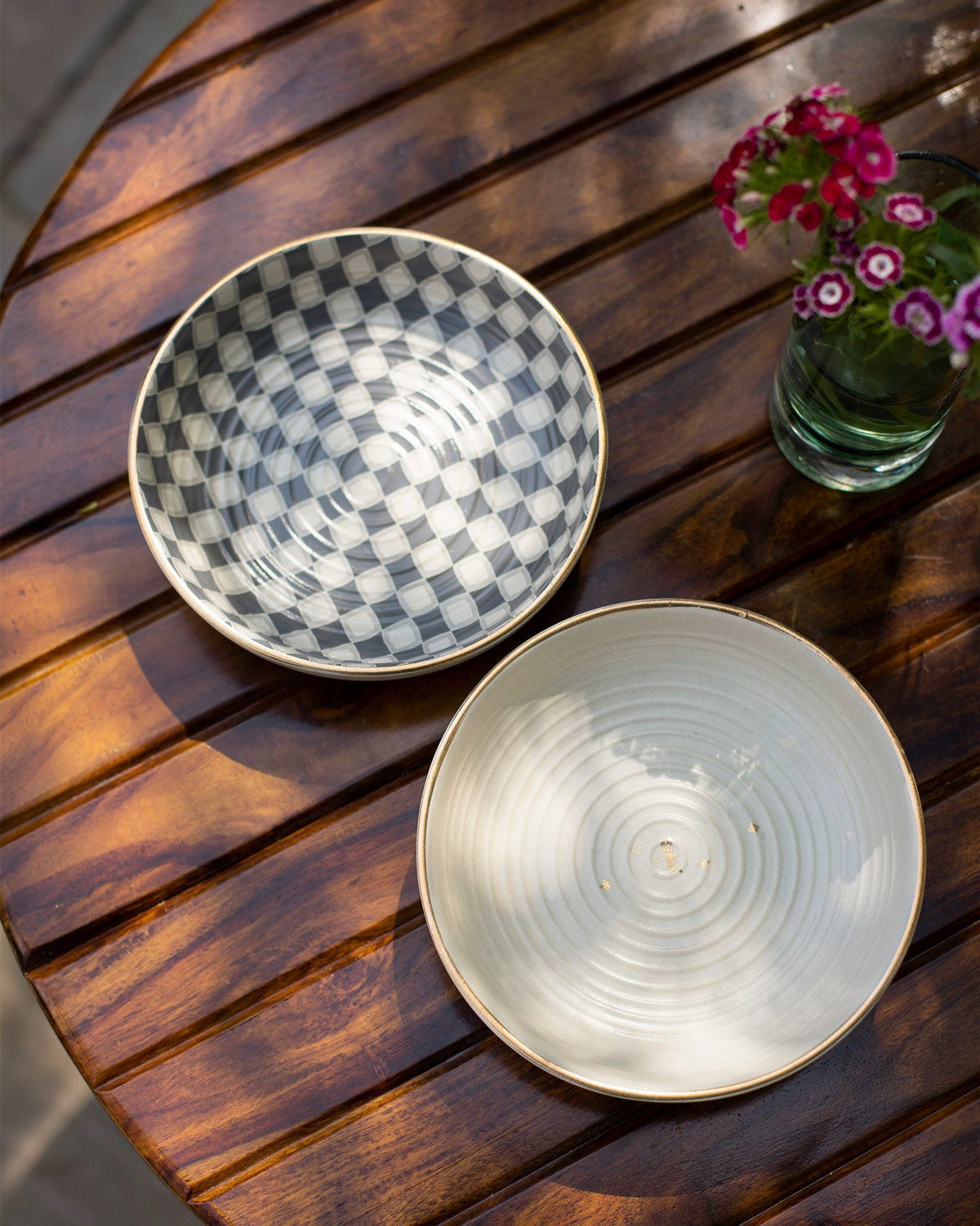 - Crafted in smooth stoneware with a graphic charcoal and gold design