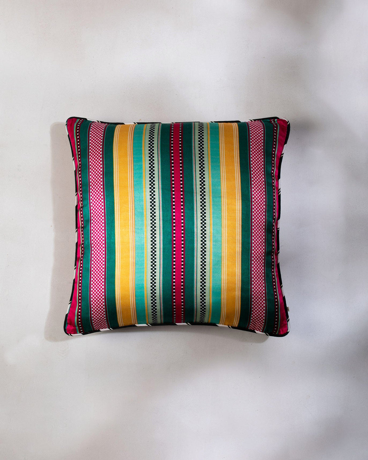 • Digi-printed on the front and back, this striped striped cushion in viscose mashru with monochrome piping around the corners