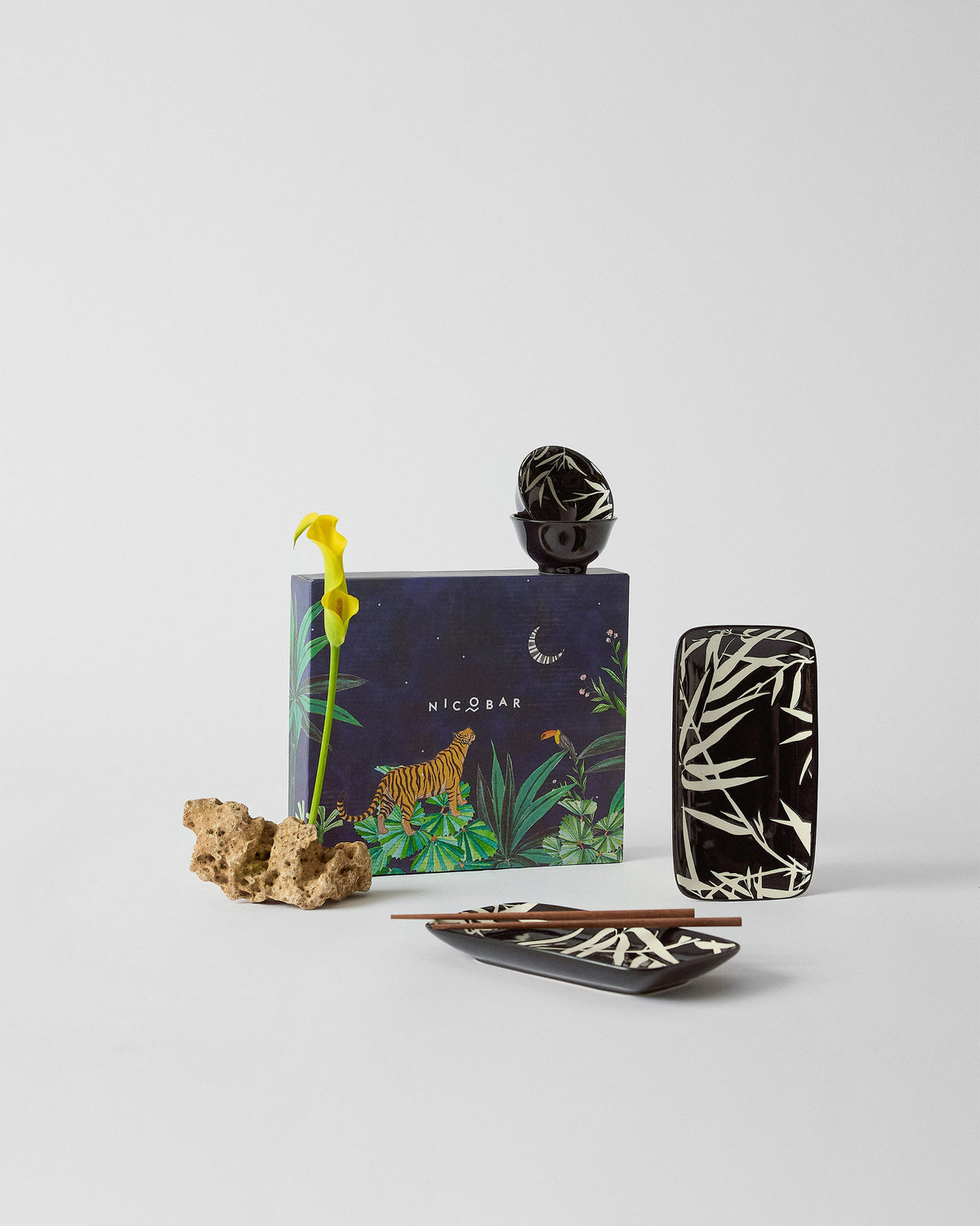 • The Island Sushi Set comes in a striking monochrome featuring handpainted foliage–perfect to trot out when you’re hosting your inner circle.