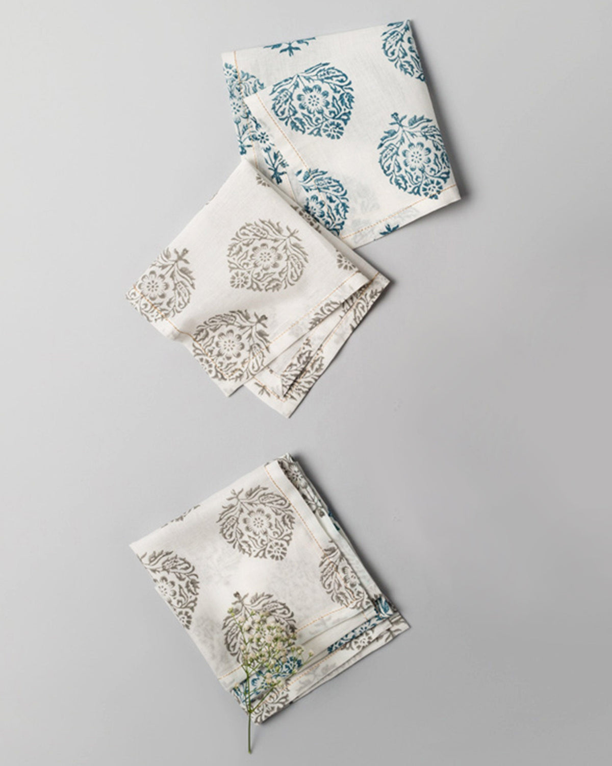 - Gossamer thin, super soft, and with the prettiest block printed detail, this set of 6 napkins features two colours - charcoal on an ivory base, and indigo