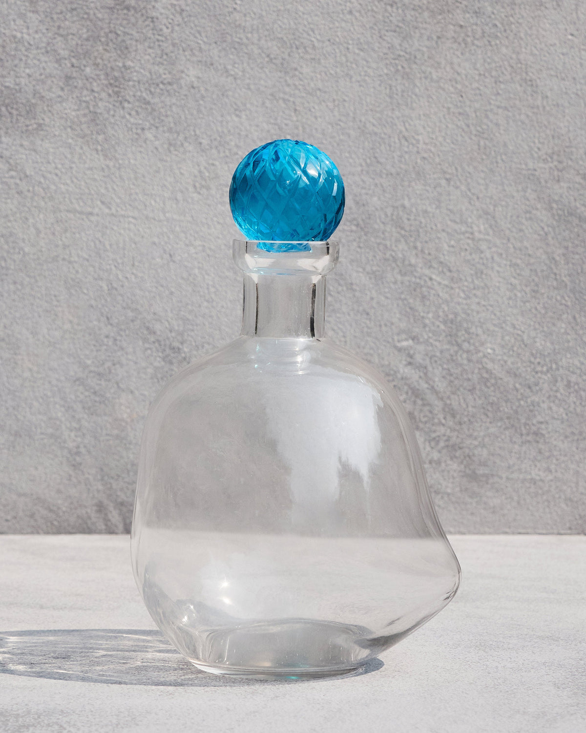 - Serve in style with the large Revel Decanter. Ideal for all your hydration needs: water, iced tea, juice, and even your everyday infusions. Place it on your dinner table, at your bar, or at your bedside. The stopper comes in a bright shade of blue.