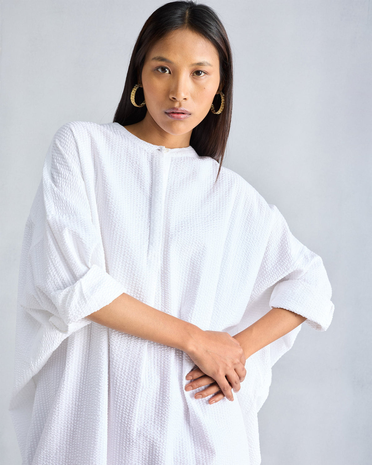 - Crafted in light seersucker with batwing sleeves, this piece works effortlessly from the boardroom to lounging by the pool.