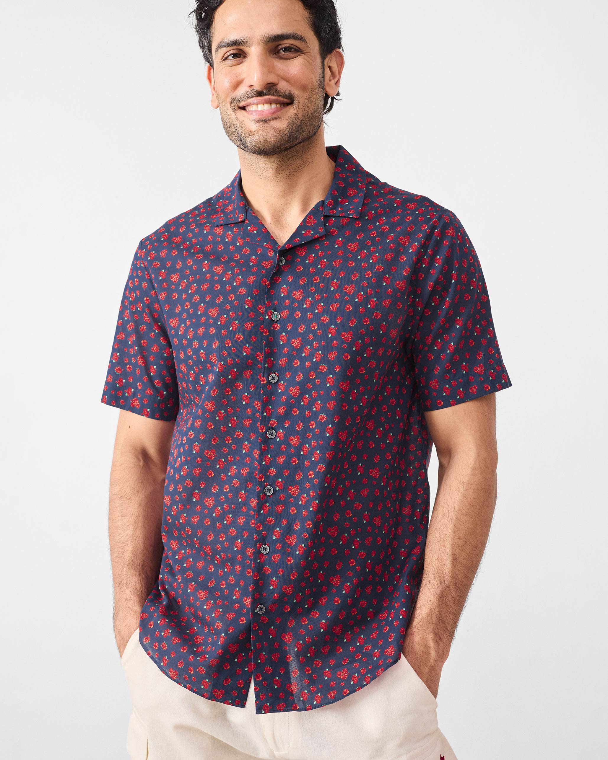 - The Myanmar Shirt comes in a classic fit in an all-over rose print in navy and red tones.