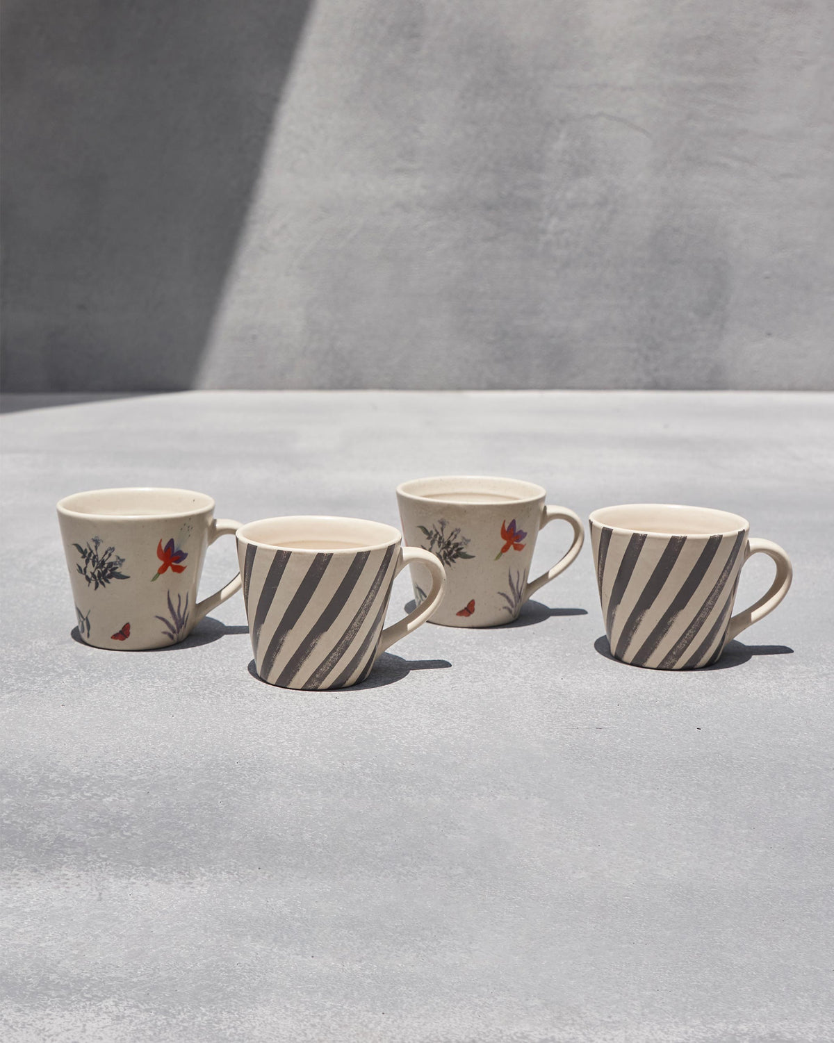 • Inspired in equal parts by India in form and China in spirit, these mugs feature classic Nico stripes and awesome blossoms