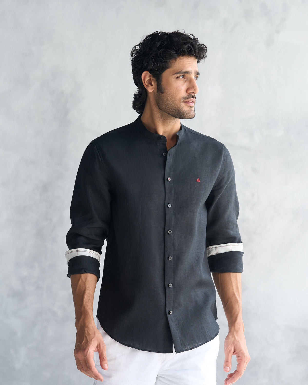 • Our token to tradition: this Nehru collar shirt is crafted in soft cotton-linen blend and comes in a slim fit.