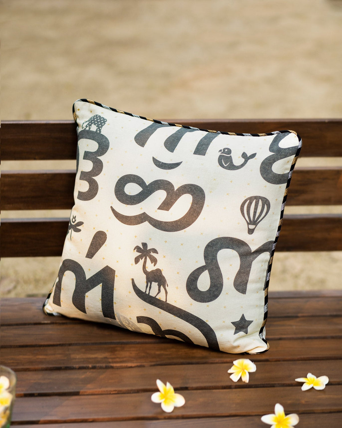 • A charcoal & ivory digi printed cushion cover with gold & silver piping around the corners