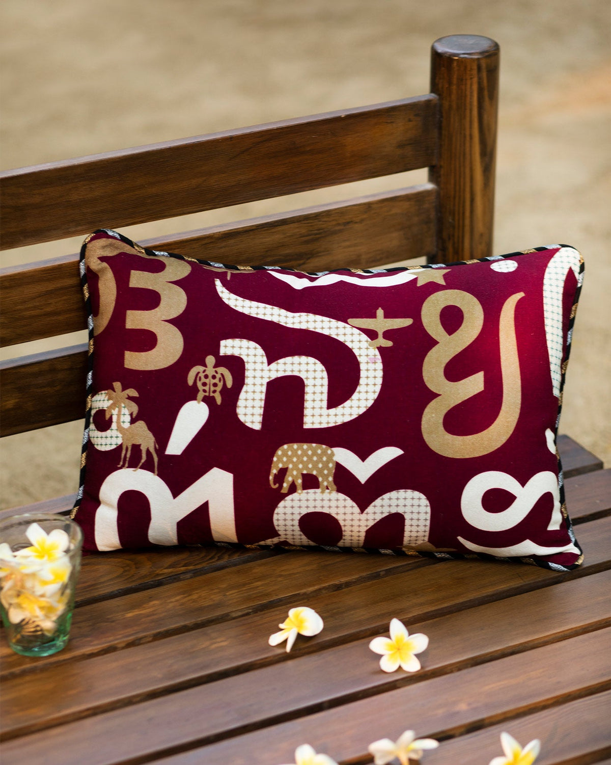 - A charcoal & ivory digi printed cushion cover with gold & silver piping around the corners