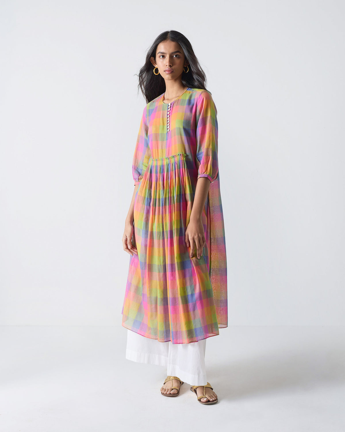 • Crafted from 100% yarn-dyed cotton, this kurta features an overall multicolored disco check pattern. The pleated waist enhances the silhouette, creating a flattering shape while maintaining comfort and ease.