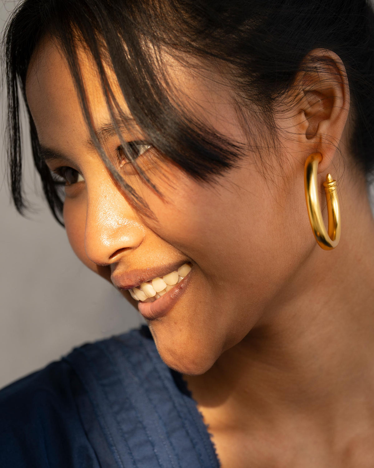 - Crafted in copper and plated in gold, these hoops can be worn as is or paired with a slim chain around your neck