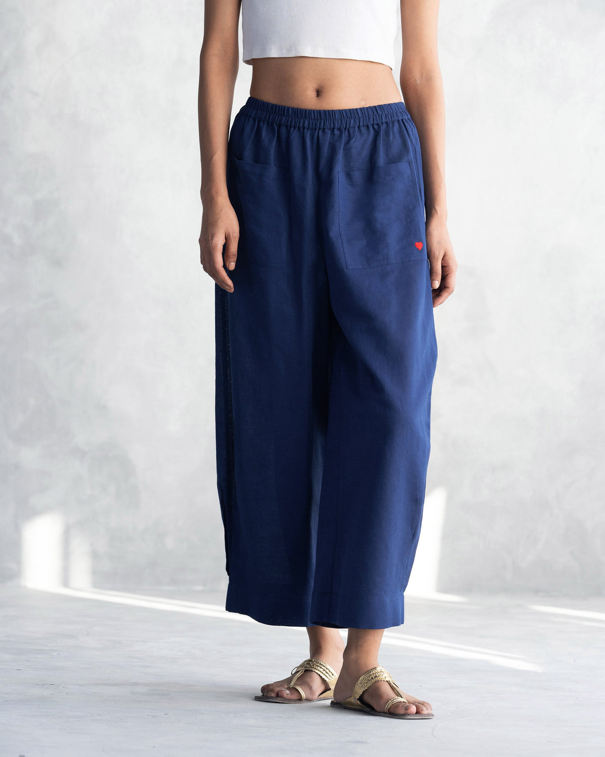 - Form meets function, these indigo pants feature two convenient patch pockets in the front, providing both practicality and a touch of flair.