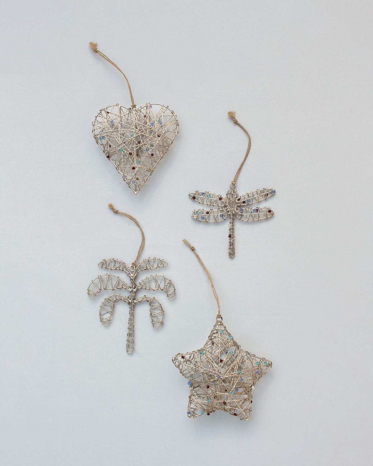 • A special set of four ornaments for a very Nico fetsive patch, these silver wire tree trinkets are meant for a sparkly Christmas, or to use as curios after.