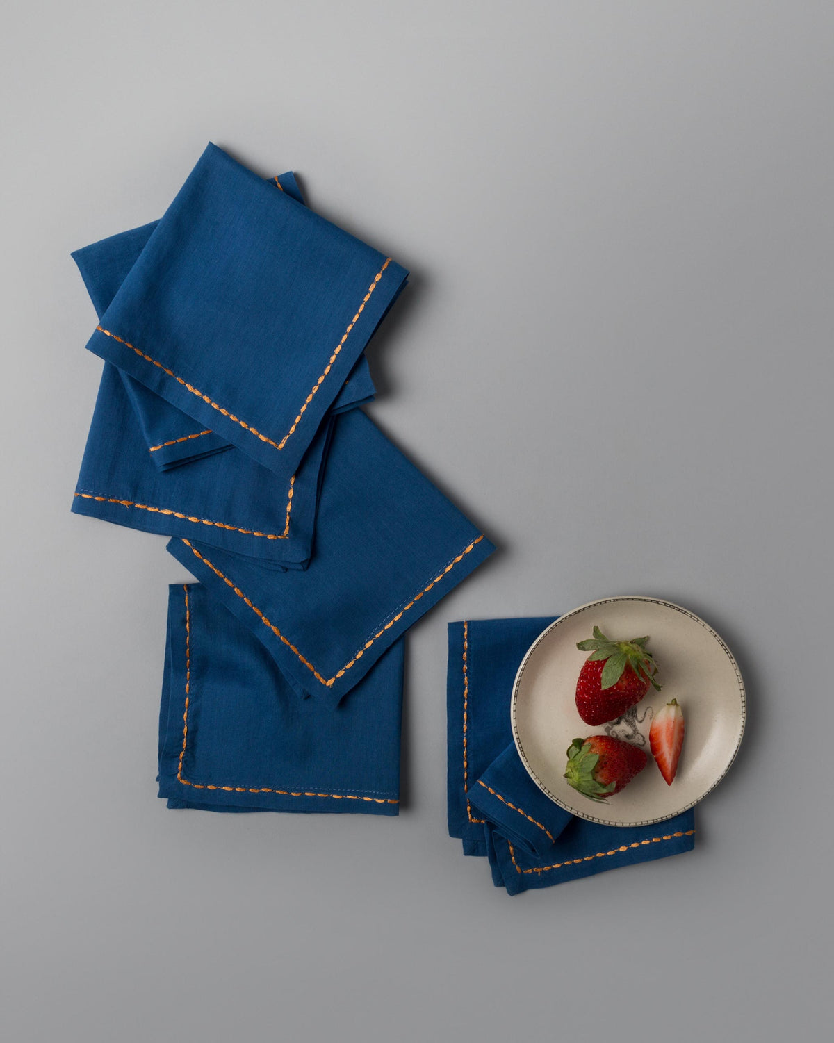 - To keep things shipshape at your latest party, we've got muted indigo cocktail napkins with a hint of tangerine chain stitch lining the edges