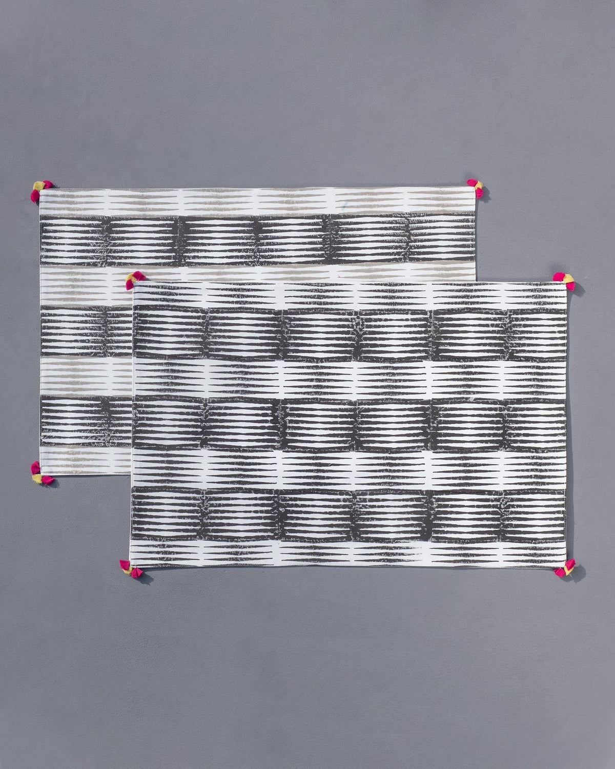 - A set of two placemats with a graphic monochrome block print, and pink and lime tassels on all four corners