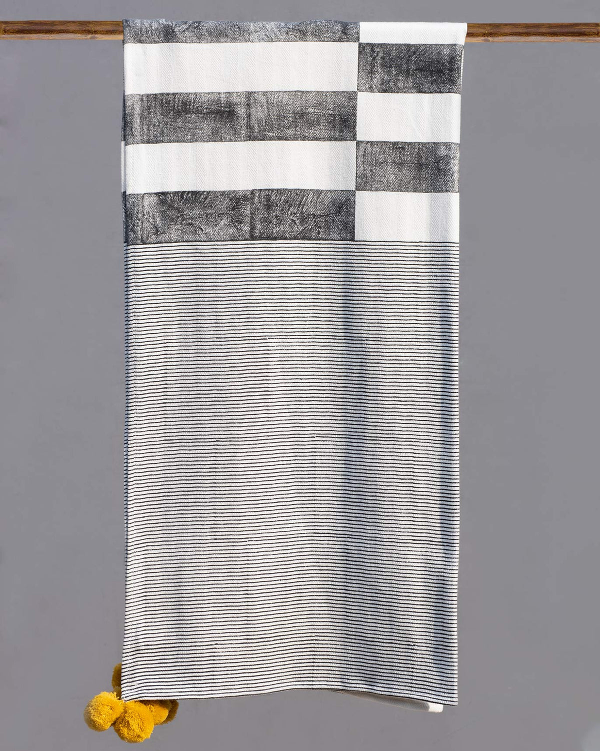 - Printed with graphic white and black stripes, and feature fluffy ochre pompoms on all four edges