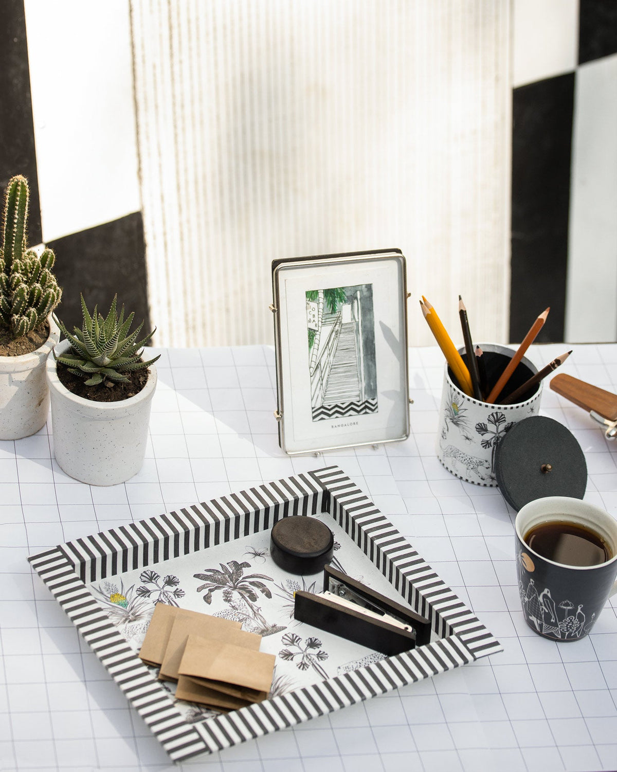 • For an organised work desk, a handy duo of our stationery set and tray featuring botanical prints, and crafted in innovative recycled paper.