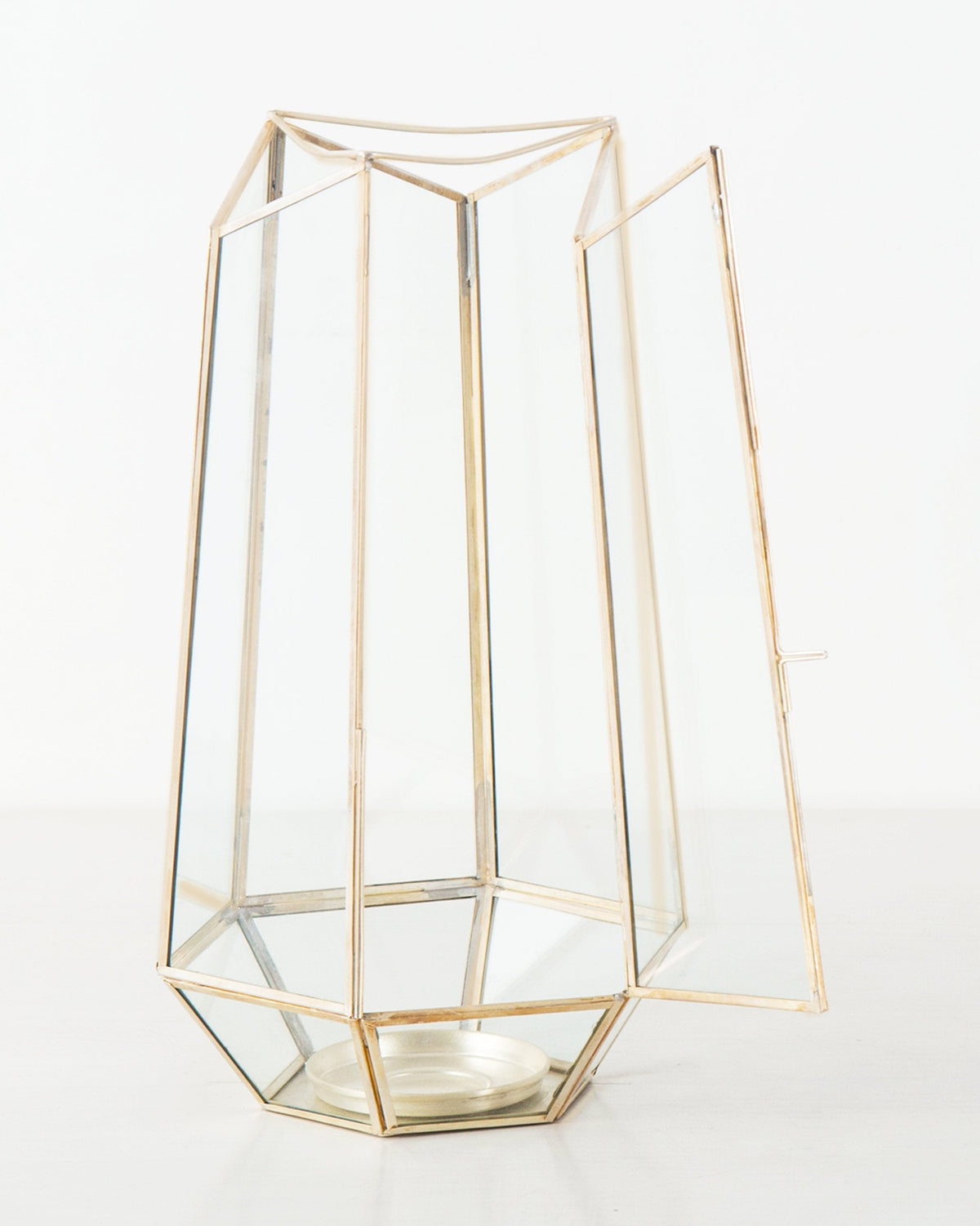 • Our glass twilight hurricanes feature accents of brass, and sit perfectly as garden decor, as well as living room spaces