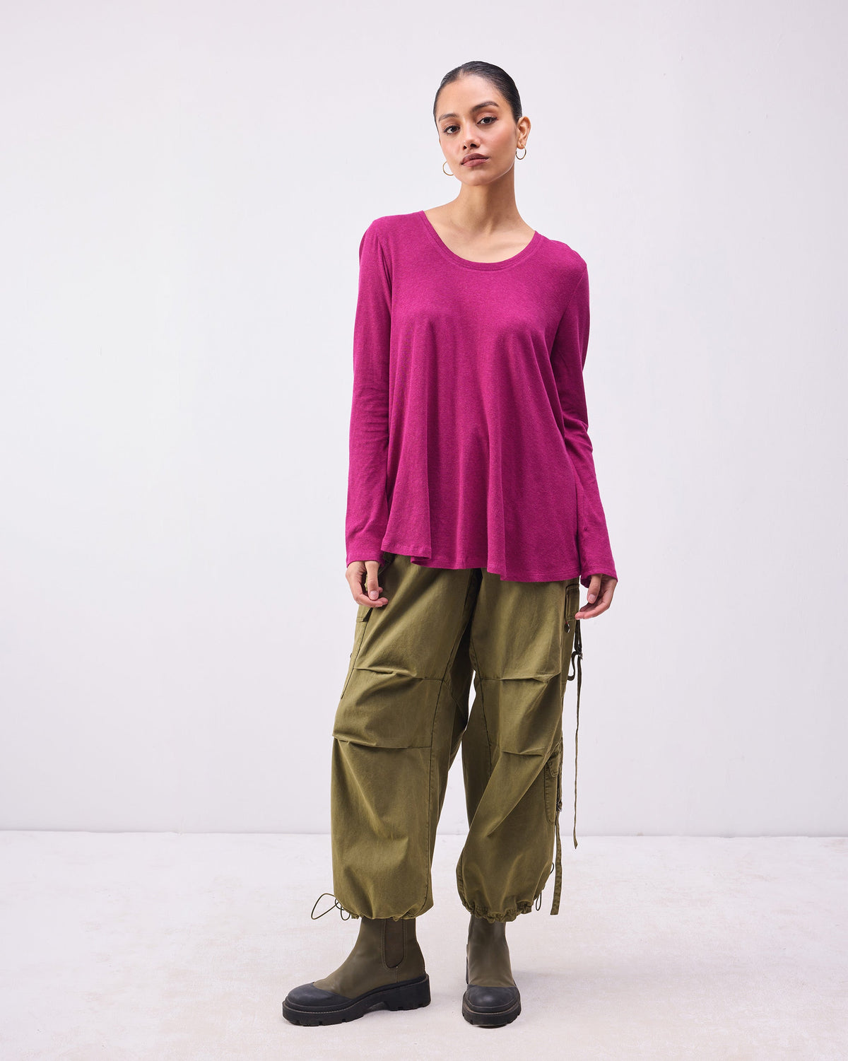 - The Ukiyo A-Line Top in Berry is crafted from 100% cotton single jersey, offering a soft and relaxed fit.